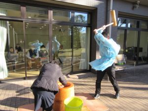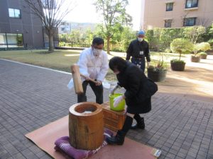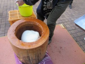 スタッフも朝から気合十分で、いよいよお餅つき大会の開催です♪